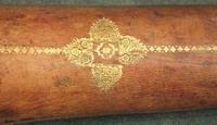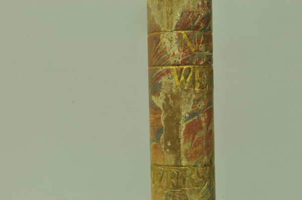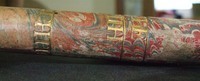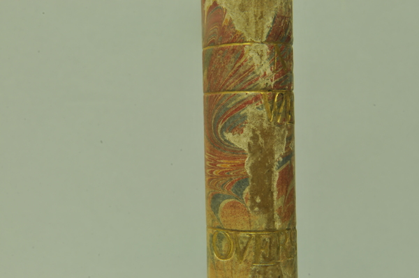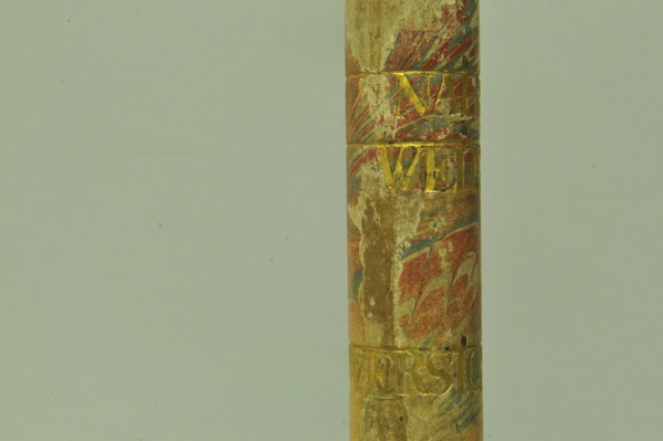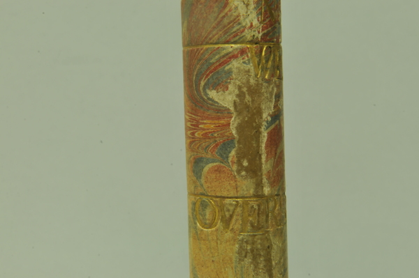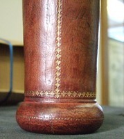 Extensions of tubes are marked with pins; each mark is accompanied by a pin that appears to do nothing else. Interior stops are made of brass. Tubes are made of wood covered with leather. Draws are covered with combed marbled paper. Each draw is wood, all the way through, made of a single piece of [apple?] wood, turned on a lathe. Tubes are snug, with leather fitting tightly on the wooden firmament.