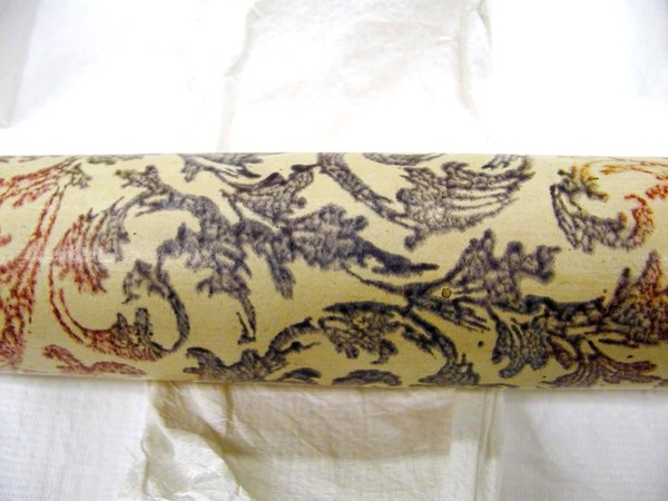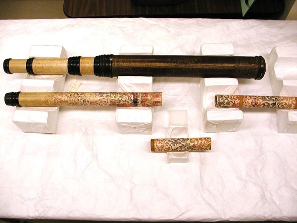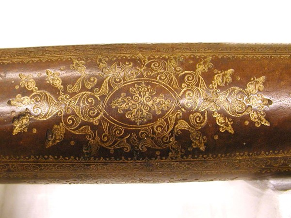 Main tube is covered in brown leather with gold tooling. There are many (11?) draw tubes with floral decorations. The objective lens is missing.