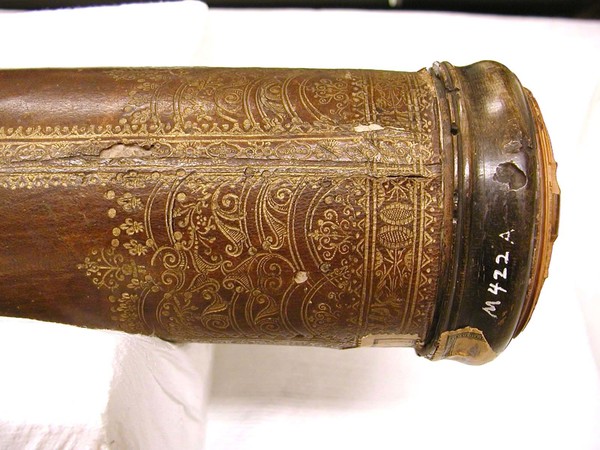 Materials: leather, glass, horn, pasteboard, vellum, wood, gold tooling