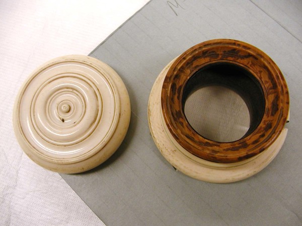 Materials: leather, paper, brass, ivory, glass, wood, pasteboard, gold tooling