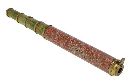 "The barrel of this non-achromatic terrestrial telescope is covered in a dyed rayskin. while the four draw tubes are made of green vellum decorated with gold-tooled motifs. The brass fittings include a sliding eyepiece and objective lens covers. The maker's name appears on the smallest draw tube as 'STERROP LONDON', probably referring to George Sterrop, who worked in St Paul's Churchyard in London in the 1740s. Stop lines, shown as rings of dots drawn onto the draw tubes, indicate the working length of the telescope" (Royal Museums Greenwich).