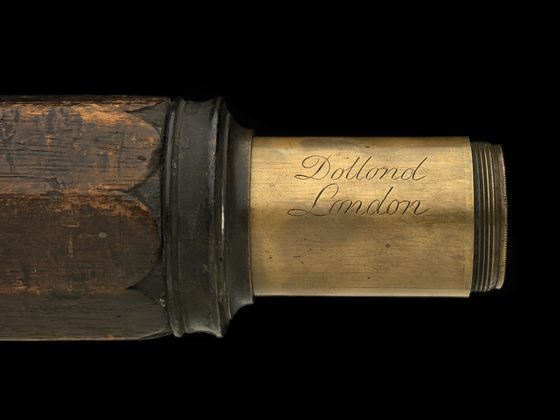 "The octagonal mahogany barrel, which is now damaged, is characteristic of telescopes produced in the 18th century for use on board ship. The barrel was designed for strength, since the techniques for manufacturing strong round barrels were not well developed at this time. The brass fittings include a single draw tube on which the maker’s name is inscribed as ‘Dollond, / London’. This was the firm started by the London optical instrument maker Peter Dollond (1731–1820). It was Peter's father, John Dollond (1706–61), who took out a patent for the achromatic lens in 1758. This type of lens eliminated the problem of coloured fringes caused by the distortion of light as it passed through the glass. The objective lens cap and parts of the eyepiece are now missing" (Royal Museums Greenwich).