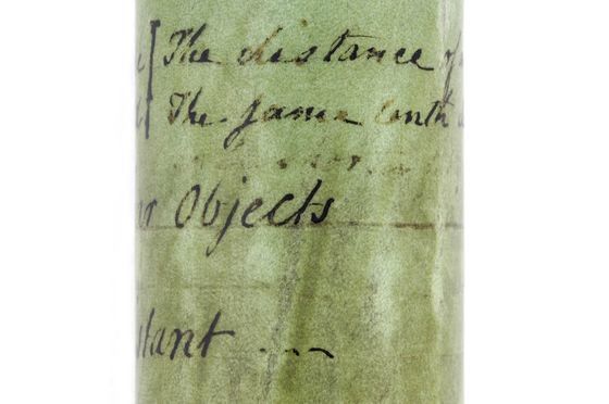 "This non-achromatic telescope has a rayskin-covered barrel and four draw tubes made of vellum. The other fittings are brass. Both the objective and eyepiece lenses had sliding lens covers, although the cover for the objective lens is now missing. Solid black lines around the draw tubes indicate the optimum working length of the telescope. The maker's name and date are engraved on the objective lens: 'John Cuff, Londini. Fecit.1736'. John Cuff (1708-92), a maker of spectacles and optical instruments, worked in Fleet Street" (Royal Museums Greenwich).