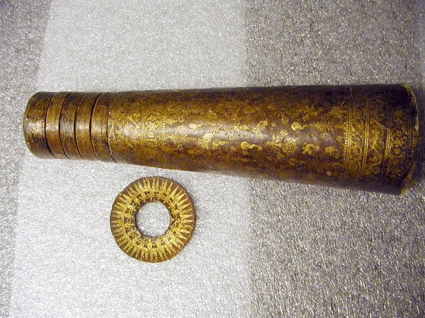 Trumpet-shaped main tube covered with gold-tooled brown leather. Five draws with equi-diameter ferrules. Large objective lens stopped down by a leather-covered diaphragm with gold sunburst motif. Edges of lens are chipped all around.