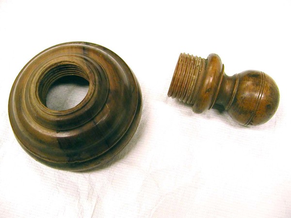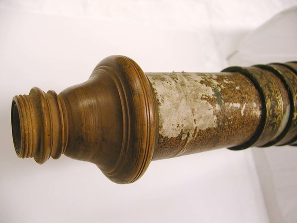 Brown leather covered main tube with gold tooling in lion and floral motifs. Six draw tubes covered with brown speckled paper, chipped in several places. Large turned wooden end caps at both ends. Objective lens is a replacement. Focal length of lens 1 of the eyepieces is estimated to be 58.4.