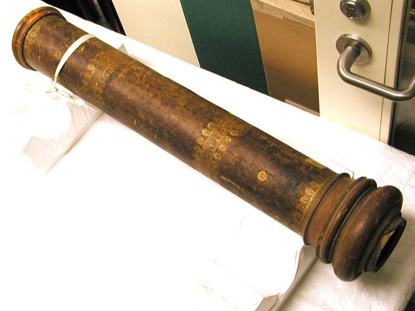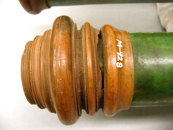 Brown gold-tooled leather covered main tube, twelve green vellum draw tubes and erector tubes, wooden ferrules and lens cells. Wooden ferrules and lens cells. When extended the length exceeds 5 meters with width of 112 mm. No lenses present.