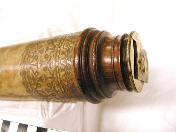 Browned vellum main tube and ferrules with blind tooling. Four green vellum draw tubes with faint, diffuse dark decorations. Wooden lens cells, brass slider on eyepiece. Signature is on the objective lens.