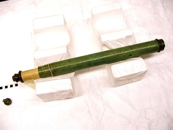 Main tube and ferrules covered in green vellum with a small amount of tooling. Five white vellum draws. Wooden lens cells on both ends with brass section for sliders. The objective cap slider is missing.