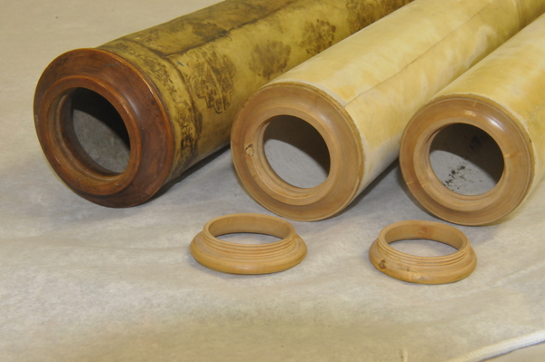"This non-achromatic telescope is made of vellum with turned wooden fittings. The barrel is decorated with tooled motifs as are the collars of the six draw tubes, which are otherwise plain. All the lenses are now missing. Unusually, the eyepiece of this telescope was at the end of the barrel, rather than at the end of the smallest draw tube. Stop lines drawn onto the tubes indicate the telescope's optimum working length of over two metres. This suggests that it would have been used with some sort of support" (collections.rmg.co.uk).