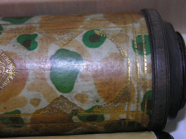 Paper tubes. Outermost of white, green, and brown-flecked parchment; inner tubes of white parchment. Ocular tube bears goal-leaf coat of arms. Similar to scopes by Christopher Cock, though catalogue states this telescope likely by "J. M. Dobler Opticus Berolini."