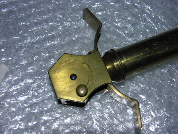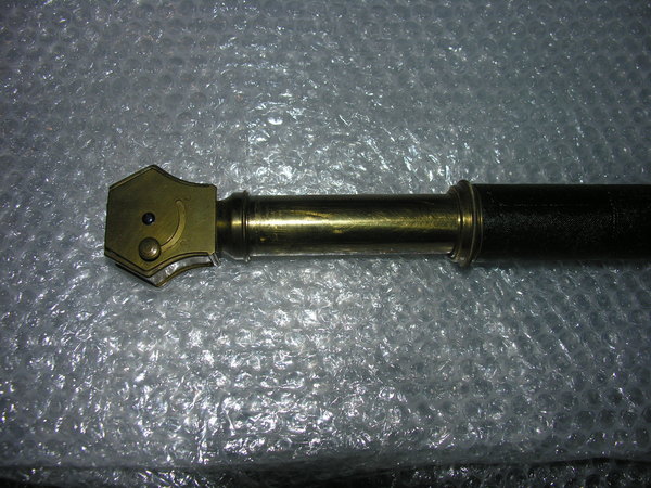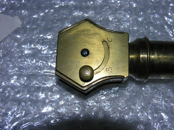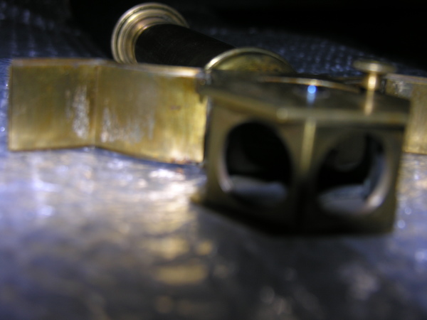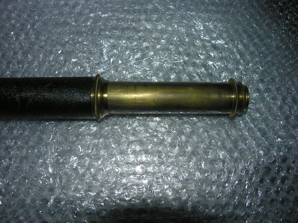 Middle tube of wood, 3 mm thick, with cover of black fish skin. One objective-side and ocular-side pull. Both pulls as well as objective and ocular lens mounts of brass. Ocular mount with closing slide. Three lenses in revolving turret in the form of a six-sided regular prism. Objective single convex lens with engraved markings.