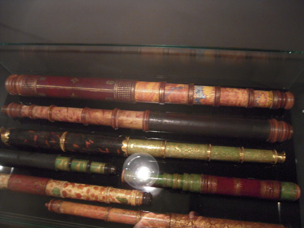 Cardboard, leather, wood construction. John Marshall (?-1723) was one of the most productive telescope makers in London around 1700 and decorated his telescopes with gold embossing.