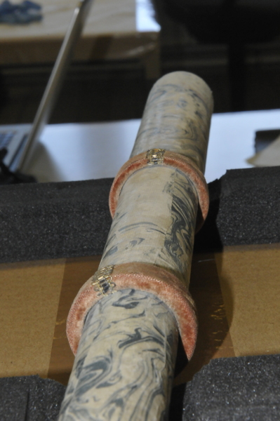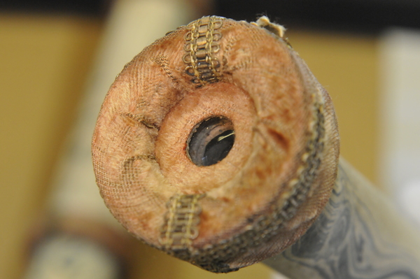 Main tube and five draws constructed of pasteboard. Each draw covered in marbled paper; end tube and ring stops in silk velvet embroidered by gold thread. Collapsed, rings and end tube form cylinder with common outer diameter (48 mm), common feature of other early scopes.