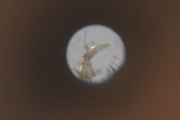 Field of view is only about 4 m at a distance of 1000 m, or under 15 arc minutes, for an eye pupil opening of 6 mm, but it gives a surprisingly clear and sharp (upright) image (Riekher, 1990).