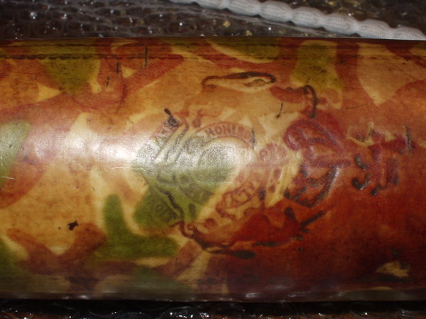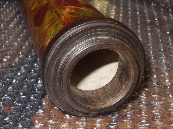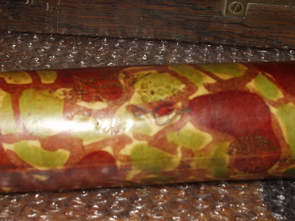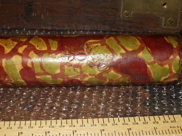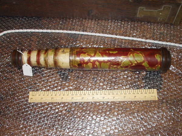 On last draw: "R. T. GUNTHER / WARLEY SALE / 2.VI. 1935". Outer tube has coat of arms with some legible letters: "HON" "MALYP…" "M[?]EV…" "ON… ROIT". Objective missing from first tube. First and second draws have lenses ca. 25 mm diameter. Single lens near eyepiece.