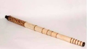 "Very large English telescope (‘reverse tapered’). The main tube has the characteristic English coloured pattern with gold tooling, among which the Royal English coat of arms. No less than eleven pasteboard drawtubes, covered with white parchment. The fittings of the objective lens and the eye lens are made of lignum vitae(pock wood). Length 65-300 cm, Ø 11 cm. Signed with a stamp: ‘Theodorus Blethyn, fecit’. The instrument strongly resembles a telescope in the Science Museum, made by Christopher Cock, which is marked ‘1673’.