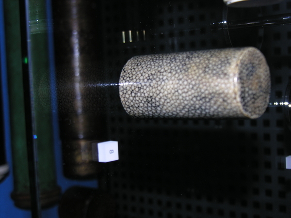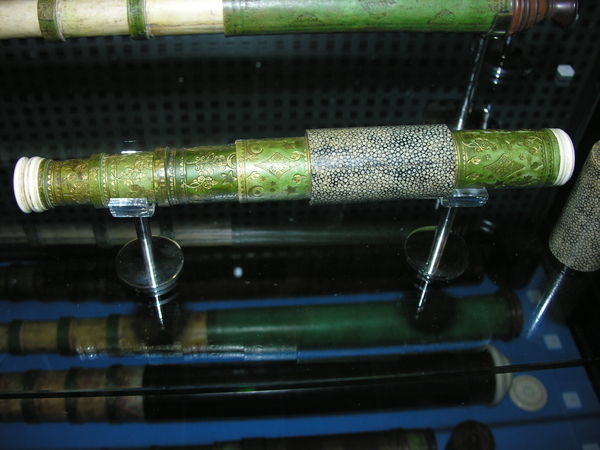 "English telescope. The main tube of the telescope is part of the casing, which is completed by two extended end caps. These parts are covered with grey coloured ray skin. The other tubes (among which three drawtubes) are covered with green coloured leather, richly tooled with floral motifs, stars and crescents. The gold tooling used is not mentioned by Turner (1966), but seems to be related to the Turner nos. 44 (flower), no. 47 (crescent with a five pointed star) and no. 51 (flower with leaves). Ivory fittings at both tube ends. Length 22-55 cm, Ø 4 cm. Unsigned, but an almost identical telescope in the British Museum is signed: ‘Howe’.