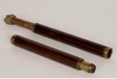"Cylindrical wooden tube in two parts, which can be screwed together by means of threaded brass bezels. There are two objectives in a rotating mount, enabling two different magnifications.