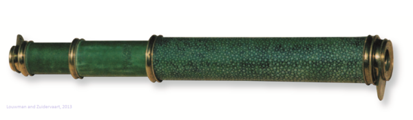 "Main tube and two drawtubes covered with green coloured ray skin. Brass fittings with protective lids. Length 19-40 cm, Ø 2.5 cm. Signed: ‘Dollond London’. Third quarter of the eighteenth century" (Louwman and Zuidervaart, 2013).