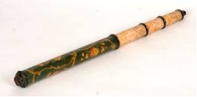 "Presumably Italian telescope. Main tube painted with floral motifs on a green background. Three lightly marbled pasteboard drawtubes. Ferrules made of horn and ditto end pieces. Unsigned. Length 47-117 cm, Ø 5 cm. Late eighteenth century" (Louwman and Zuidervaart, 2013).