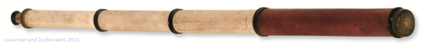 "Presumably Italian telescope. Main pasteboard tube coloured red. Three white pasteboard drawtubes. Ferrules and end pieces made of horn. Unsigned. Length 23 - 56 cm, Ø 2.7 cm. Late eighteenth century" (Louwman and Zuidervaart, 2013).